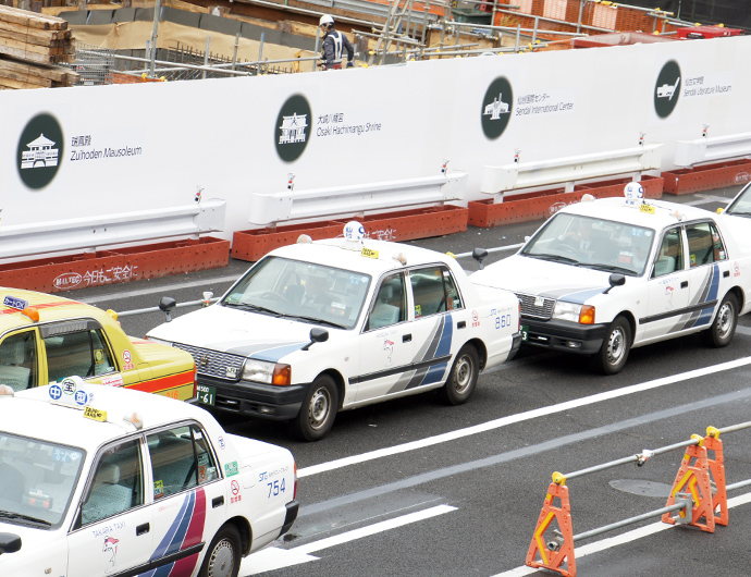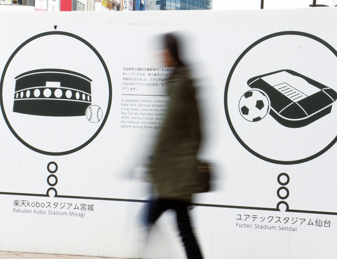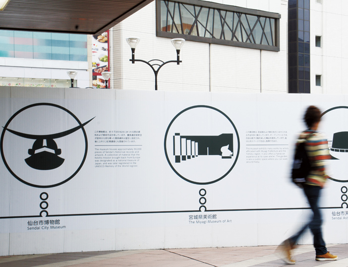 仙台駅の大改修による大量の工事中仮囲いを、統一的にデザインしたものです。