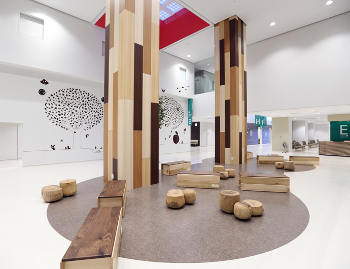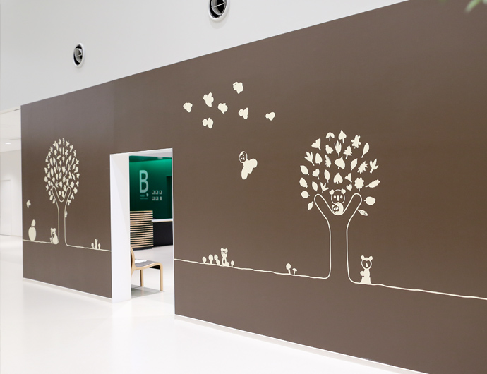 近隣の小、中学生が描いたイラストを使用して、さまざまなサインや環境のグラフィックを開発しました。