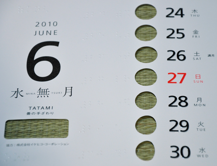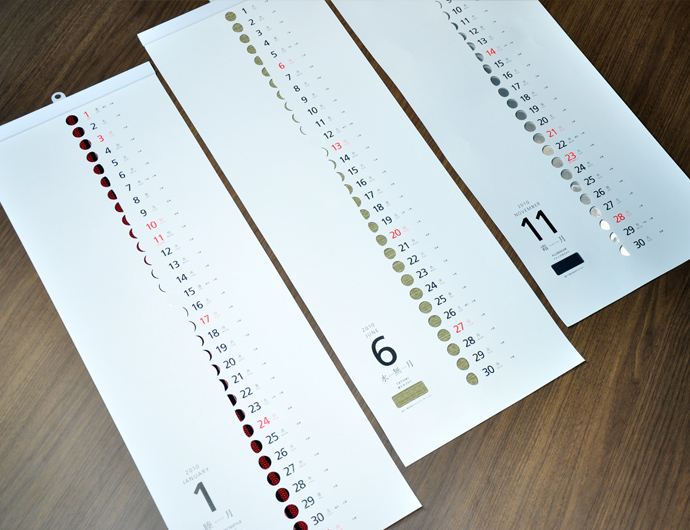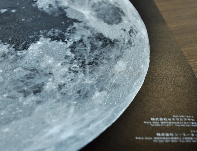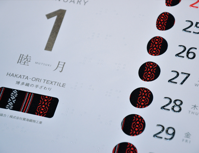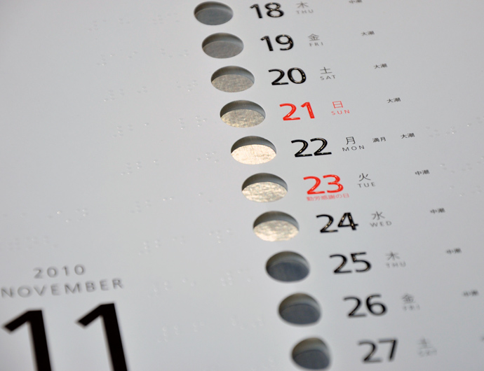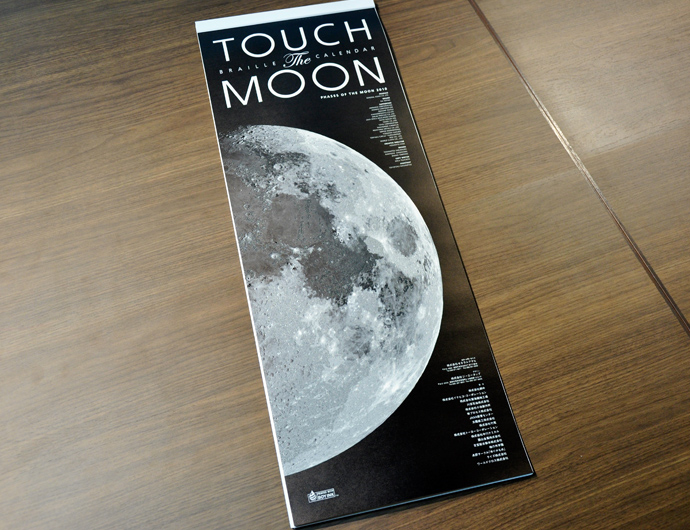 視覚障がい者も触知で利用できるカレンダーです。表紙の写真は透明インキで月面の山と谷の凹凸を表現しています。日にちの数字も透明インキの凹凸で、月齢は12種類の素材を触ることにより知ることができます。